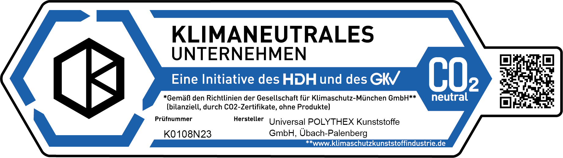 Die Universal Polythex Kunststoffe GmbH hat erneut ein bedeutendes Ziel erreicht: Wir sind ab sofort stolzer Inhaber des Zertifikats für klimaneutrale Unternehmen!